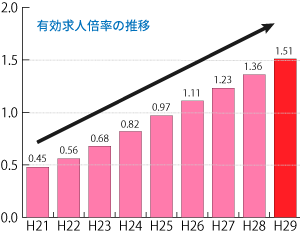 日本は好景気が続き、かつての求人不足から人材不足の転職市場へと変化しています。求人数は増え続け、有効求人倍率は平成29年に【1.51倍】となりました。